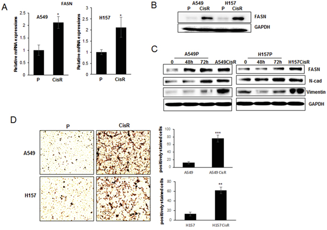 There were significantly higher FASN levels in A549CisR and H157CisR cells than in parental cells (Figure 2A, qPCR data, Figure 2B, Western blot data). To determine whether the increased levels of FASN in cisplatin-resistant cells is due to accumulated effects of cisplatin treatment, the FASN levels in A549P and H157P cells after short-term cisplatin treatment were also investigated. As shown in Figure 2C, we found up-regulation of FASN in A549P and H157P cells when they were treated with cisplatin (5 μM) for 48 to 72 hours (Figure 2C). Increase of two randomly selected EMT markers, N-cad and vimentin, was shown in these cells after cisplatin treatment (Figure 2C).