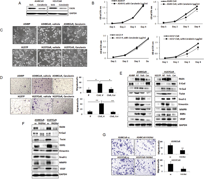 Figure 3: Inhibition of FASN reduced EMT/metastasis potential of cisplatin-resistant cells. A. Western blot analyses of FASN in A549CisR and H157CisR cells upon cerulenin (1 μg/ml, 48 hours) treatment. B. Growth assay. A549P and H157P and A549CisR and H157CisR (1 x 103) were plated in 96 well plates, and the growth of cells in presence of cerulenin (1 μg/ml) or vehicle (control) was analyzed at each day in MTT assays. C. Morphology test. A549P, H157P, A549CisR and H157CisR cells were seeded. A549CisR and H157CisR cells were treated with cerulenin (1 μg/ml) or vehicle (control) for 48 hours and cell morphology was observed under a microscope. D. Migration test. A549P, H157P, A549CisR and H157CisR cells were seeded. A549CisR and H157CisR cells (1 x 104) were treated with cerulenin (1 μg/ml) or vehicle (control) for 48 hours. Cells were then placed in upper chamber of transwell plates and migrated cells to the lower chamber at the end of 24 hours incubation were counted under a microscope after crystal violet staining. Quantitation shown on right. E. Western blot analyses of EMT/metastasis markers. Cell extracts were obtained from parental cells and cerulenin (or vehicle)-treated A549CisR and H157CisR cells and Western blot analyses were performed using antibodies against indicated molecules. F. Western blot analyses of EMT/metastasis markers in A549CisR-FASNsi/sc and H157CisRCisR-FASNsi/sc cell sets. Cell extracts were obtained and Western blot analyses were performed using antibodies against indicated molecules. G. Migration test. A549CisR-FASNsi/sc and H157CisRCisR-FASNsi/sc cells were placed in upper chamber of transwell plates and migrated cells to the lower chamber at the end of 24 hours incubation were counted under a microscope after crystal violet staining. Quantitation shown on right. *p<0.05, **p<0.01.