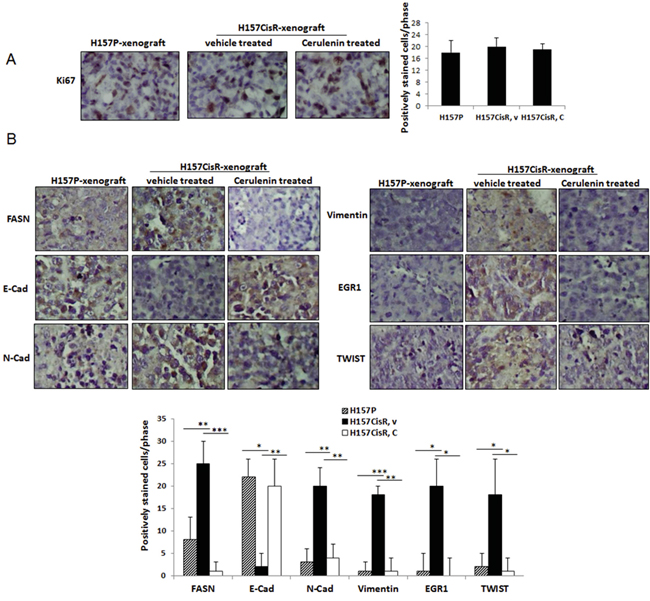 Figure 4: In vivo mice studies. A, B. IHC staining of tumor tissues using antibodies of Ki67 (A) and EMT/metastasis markers (B). Mice (H157CisR cell-derived xenograft) were sacrificed 3 days at the completion of cerulenin (or vehicle) treatment (H157P cell-derived xenografts did not receive treatment) and tumor tissues were obtained. The processed tumor tissues were cut into 5 μm, and stained with antibodies of FASN and EMT/metastasis markers. For Ki67 staining, tissues were subjected to antigen retrieval before staining. Magnification, x 100. Quantitation shown below. *p<0.05, **p<0.01, ***p<0.001.