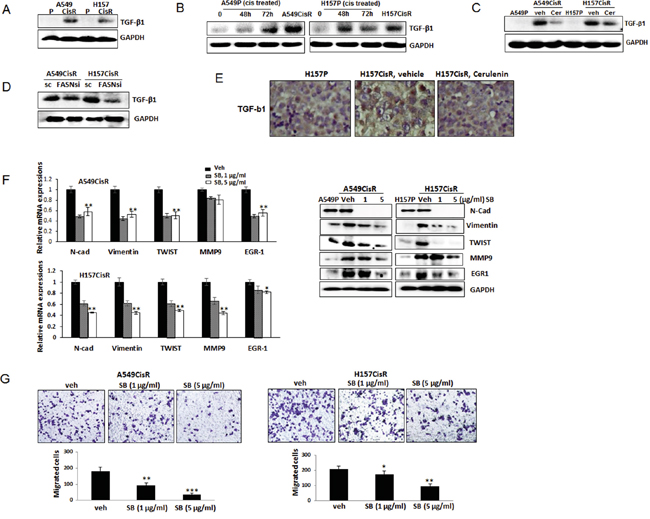 Figure 5: TGF-β1 is FASN downstream signaling that is important in mediating EMT/metastasis increase of cisplatin-resistant NSCLC cells. A. Western blot analysis showing TGF-β1 levels in A549P/A549CisR and H157P/H157CisR cells. B. Western blot analysis showing TGF-β1 increased expression in A549P and H157P cells treated with cisplatin at 5 μM for 48 hours or 72 hours. C. Western blot analysis showing TGF-β1 level decrease in A549CisR and H157CisR cells with cerulenin treatment (1 μg/ml, 48 hours). D. Western blot analysis showing TGF-β1 levels in A549CisR-FASNsi/sc and H157CisR-FASNsi/sc cells. E. TGF-β1 IHC staining of tumor tissues obtained in mice studies. F. qPCR (left) and Western blot (right) analyses showing expression of the EMT/metastasis markers in A549P/A549CisR and H157P/H157CisR cells after treatment with either vehicle or the TGF-β1 inhibitor, SB525334 (1 and 5 μg/ml) for 48 hours. G. Migration assay using A549CisR and H157CisR cells pre-treated with either vehicle or the TGF-β1 inhibitor, SB525334 (1 and 5 μg/ml, 48 hrs). *p<0.05, **p<0.01, ***p<0.001.