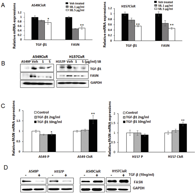 Figure 6: TGF-β1 induces FASN in cisplatin-resistant lung cancer cells. A, B. qPCR (A) and Western blot (B) analysis showing TGF-β1 and FASN mRNA (A) and protein (B) levels in A549CisR and H157CisR cells upon treatment with either vehicle or the TGF-β1 inhibitor SB525334 (SB) for 48 hours. C, D. qPCR (C) and Western blot (D) analysis showing FASN mRNA and protein levels in A549P/A549CisR and H157P/H157CisR cells after culturing with hrTGF-β1 (2 and 10 ng/ml) (24 hours of incubation for mRNA level study and 72 hours of incubation for protein analysis). *p<0.05, **p<0.01.