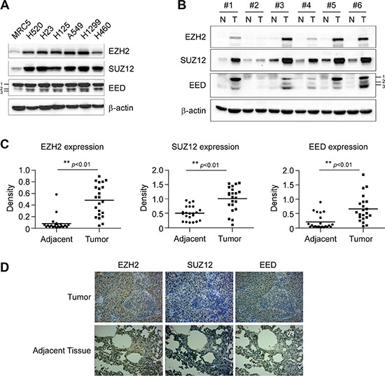 Figure 1: Aberrant overexpression of PRC2 proteins EZH2, SUZ12 and EED in human non-small cell lung cancer. (A) PRC2 components EZH2, SUZ12 and EED are highly expressed in NSCLC cells. Western blot analysis was performed to examine EZH2, SUZ12 and EED expression in several NSCLC cell lines and normal MRC5 lung cells. EED isoforms are numbered. β-actin was used as a loading control. (B, C and D). EZH2, SUZ12 and EED are highly expressed in human NSCLC tissues. EZH2, SUZ12 and EED protein levels in six representative NSCLC cases were assessed by Western blot analysis. β-actin was used as a loading control. N, adjacent normal tissues; T, tumor (B). Western blotting determined EZH2, SUZ12 and EED protein levels in malignant and the corresponding normal adjacent tissues of 22 NSCLC patients. The intensity was evaluated using Image J (NIH) computer software. **p <0.01, significant difference between groups as indicated (C). Representative figures of immunohistochemical staining for EZH2, SUZ12 or EED were performed on NSCLC tissues and the corresponding normal adjacent samples (D).
