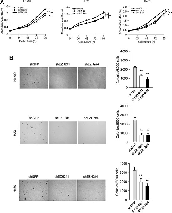 Figure 2: Knocking down the PRC2 catalytic component EZH2 expression reduces human non-small cell lung cancer cells proliferation in vitro. (A) Knockdown of EZH2 attenuates NCI-H1299, NCI-H23 and NCI-H460 anchorage-dependent cell growth. WST-1 assays were performed as described in Materials and Methods. The asterisk (**) indicates a significant (p < 0.01) decrease in cell proliferation by knockdown cells. The observed significant difference for H1299, H23 and H460 started from 48 h, 24 h and 48 h, respectively. (B) Knockdown of EZH2 attenuates NCI-H1299, NCI-H23 and NCI-H460 anchorage-independent cell growth. Soft agar assays were performed as described in Materials and Methods. The asterisk (**) indicates a significant (p < 0.01) decrease in colony formation by knockdown cells.