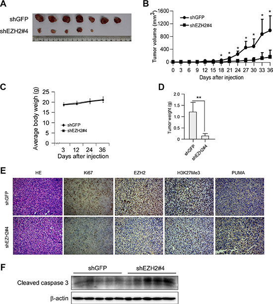 Figure 3: Knocking down the PRC2 catalytic component EZH2 expression inhibits tumor growth in vivo. (A, B, C and D) Knockdown of EZH2 reduces tumorigenic properties of NCI-H1299 NSCLC cells. Photographs of tumors dissected from mice (n = 7) injected with H1299-shGFP or H1299-shEZH2#4 cells (A), tumor growth curve (B), average body weight of mice (C) and total average tumor weight (D) from each group were shown. Data are represented as means ± SD of each group. *p < 0.05, **p < 0.01, significant difference compared with the group injected with H1299-shGFP cells. (E) Immunohistochemical examination of Ki67, EZH2, histone H3 lysine 27 trimethylation and PUMA in tumor sections from H1299-shGFP or H1299-shEZH2#4 xenograft mice. Representative photographs for each antibody and each group were shown. (F) Tumor tissue lysates were prepared and Western blot analysis was done for cleaved caspase 3 to assess the effect of EZH2-knockingdown on cell apoptosis. β-actin was used as a loading control.