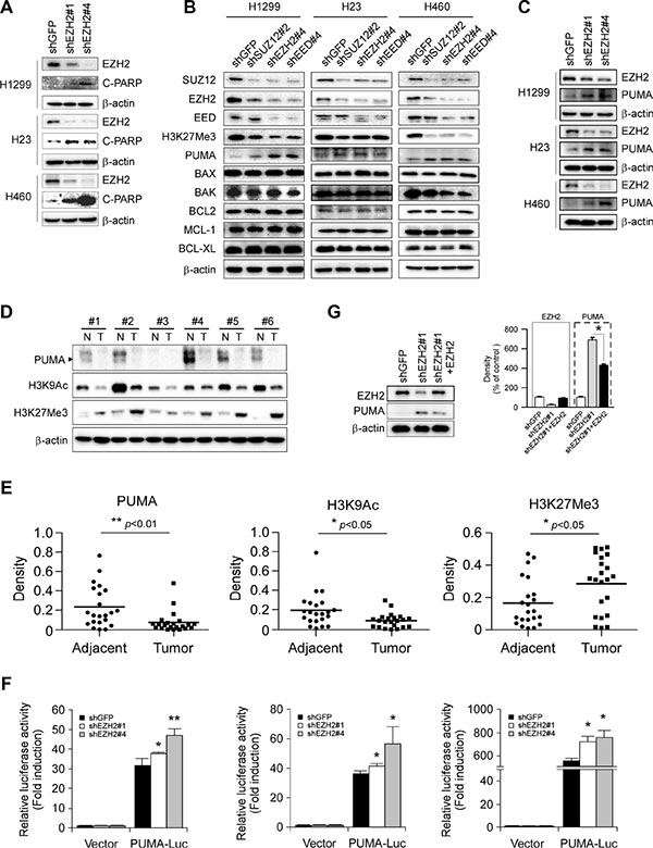 Figure 4: Effects of PRC2 repression on the expression of proapoptotic and antiapoptotic proteins in non-small cell lung cancer cell lines. (A) Stable knockdown of EZH2 with two shRNA sequences (shEZH2#1 and shEZH2#4) in NCI-H1299, NCI-H23 or NCI-H460 cells and whole cell extracts were analyzed by Western Blotting for the cleavage of PARP. β-actin was used as a loading control. (B) Stable knockdown of PRC2 component SUZ12, EZH2 or EED in NCI-H1299, NCI-H23 or NCI-H460 cells and the levels of PRC2 proteins, H3K27Me3, proapoptotic proteins (PUMA, BAX, BAK) and antiapoptotic proteins (BCL2, MCL-1, BCL-XL) were examined by Western blot analysis as indicated. β-actin was used as a loading control. (C) Stable knockdown of EZH2 with two shRNA sequences (shEZH2#1 and shEZH2#4) in NCI-H1299, NCI-H23 or NCI-H460 cells and the levels of EZH2 and PUMA were examined by Western blot analysis as indicated. β-actin was used as a loading control. (D, E) Evaluation the levels of PUMA, H3K9Ac and H3K27Me3 in human NSCLC tissues. PUMA, H3K9Ac and H3K27Me3 levels in six representative NSCLC cases were assessed by Western blot analysis. β-actin was used as a loading control. N, adjacent normal tissues; T, tumor (D). Western blotting determined PUMA, H3K9Ac and H3K27Me3 levels in malignant and the corresponding normal adjacent tissues of 22 NSCLC patients. The intensity was evaluated using Image J (NIH) computer software. *p < 0.05, **p < 0.01, significant difference between groups as indicated (E). (F) Dual luciferase reporter assays of plasmid DNA encoding a fragment of human Puma promoter in NSCLC cells were performed as described in Materials and Methods. Promoter reporter plasmid was transfected into stable EZH2- knockdown H1299 (left panel), H23 (middle panel) or H460 (right panel) cells. Firefly luciferase readings were normalized to Renilla luciferase to correct for transfection efficiency. Puma promoter-driven luciferase activities were expressed as fold induction over the activity of pBV-Luc vector. All experiments were performed in triplicate with at least two independent experiments. *p < 0.05, **p < 0.01, significant difference compared with the shGFP control cells. (G) Stable EZH2 knockdown NCI-H460 cells with shEZH2#1 targeting the 3′UTR of Ezh2 gene were transiently transfected with constructs encoding HA-tagged human EZH2 as described in Materials and Methods. Western blot analysis was done for protein expression levels of EZH2 and PUMA (left panel). β-actin was used as a loading control. The density of each protein was shown (right panel). The intensity was evaluated using Image J (NIH) computer software. *p < 0.05, significant difference between the shEZH2#1 cells and the shEZH2#1 + EZH2 cells.