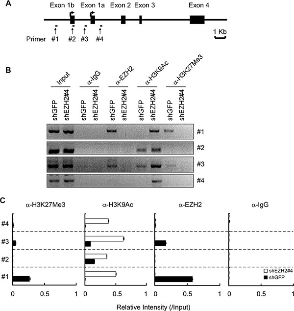 Figure 5: EZH2 binds to the Puma gene and regulates histone H3 modification. (A) Schematic representation of the Puma gene locus. The location of primers (#1 to #4) and exons are indicated. (B, C) H1299-shGFP and H1299-shEZH2 cells were subjected to ChIP assays with an antibody against EZH2, H3K9Ac, H3K27Me3 or normal rabbit IgG. The precipitated DNA fragments were subjected to PCR analysis to test for the presence of sequences corresponding to the Puma gene locus. The data were normalized to input and shown as means ± SD of two separate experiments.