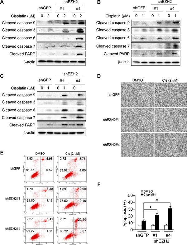 Figure 6: Knockdown of the PRC2 catalytic component EZH2 sensitizes non-small cell lung cancer cells to cisplatin-mediated apoptosis. (A, B and C) Stable EZH2 knockdown NCI-H1299 (A), NCI-H23 (B) and NCI-H460 (C) cells were treated without (DMSO) or with the indicated concentrations of cisplatin for 48 h, whole-cell extracts were analyzed by Western blotting. Cleavage of caspase 3, 6, 7, 9 or PARP was detected after cisplatin treatment. β-actin was used as a loading control. (D) Stable EZH2 knockdown NCI-H1299 cells were treated without (DMSO) or with 2 μM cisplatin for 48 h, bright field pictures were taken to show cell morphology. (E, F) Stable EZH2 knockdown NCI-H1299 cells were treated without (DMSO) or with 2 μM cisplatin for 48 h and stained by propidium iodide and Annexin V-FITC, then analyzed by flow cytometry to determine the apoptotic cells. Data represent mean ± SD from two independent experiments. *, p < 0.05, significant difference compared with the shGFP control cells.