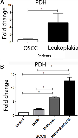 Figure 1: PDH levels in patients and the effect of metformin on PDH levels in SCC9 cells. In (A), the expression of PDH in patients with carcinoma and leukoplakia. PDH mRNA levels were increased in Leukoplakia in comparison to OSCC. (B) The treatment of SCC9 cells increases PDH mRNA levels even under hypoxia. *Statistical significance.
