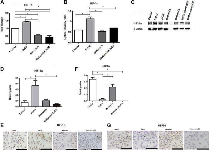 Figure 2: Effect of Metformin on HIF1A-1α under hypoxic conditions. (A) Metformin reduced HIF1A-1α mRNA levels even under hypoxia. Metformin also reduced HIF1A-1α protein levels in comparison to CoCl2. Metformin even reduced HIF1A-1α protein levels (B) Quantification of optical density ratio and (C) Western Blot and nuclear staining (D and E). Metformin reduced HSP90 levels (F and G). *Statistical significance.