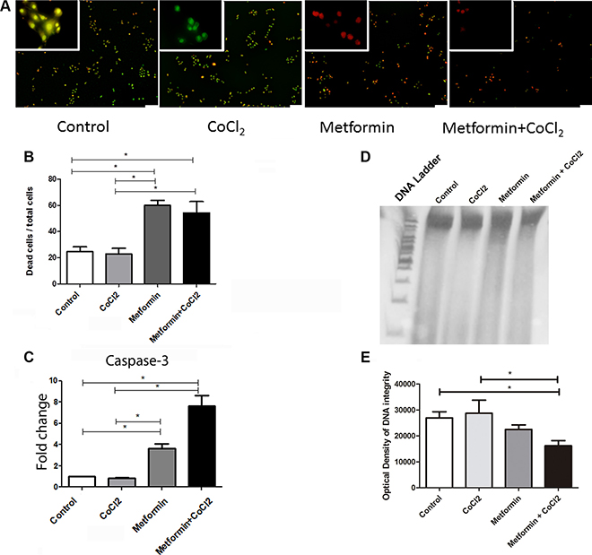 Figure 4: Effect of Metformin on cell death under hypoxic conditions. AO/EB representative figures (A) and quantification (B) show an increase in cell death as a consequence of Metformin treatment. Metformin also increased caspase-3 mRNA levels in SCC9 cells (C). Metformin treatment promotes the reduction of DNA integrity in cells under hypoxia (D and E). The scale of 100 μm. *Statistical significance.