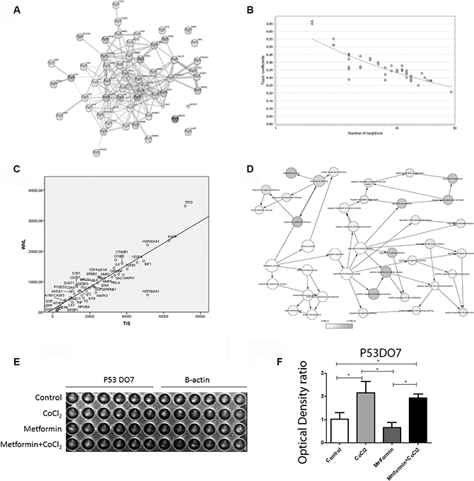 Figure 5: Pathways affected by Metformin treatment in the hypoxic OSCC context. Bioinformatics and interaction networks analysis is demonstrated in (A) STRING network results, (B) power law behavior of the network, (C) Leader genes approach suggested that P53 was the leader gene and (D) Ontological analyses demonstrated that different mechanisms associated with death control were related to Metformin treatment. In-Cell Western Immunofluorescence Assays Chanel image (E) showed that metformin did not change P53 mutated protein expression (F) *Statistical significance.