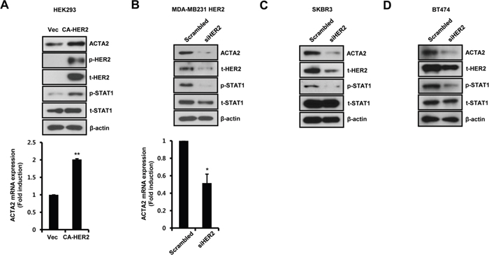 Figure 2: Alteration of HER2 expression regulates ACTA2 expression. A. HEK293 cells were transiently transfected with vec or CA-HER2 for 48 h. B-D. HER2-overexpressing MDA-MB231, SKBR3, and BT474 cells were transiently transfected with scrambled or siHER2 for 48 h. The levels of ACTA2, p-HER2 (pT877), t-HER2, p-STAT1 (pS727), t-STAT1, and β-actin were analyzed by western blots. ACTA2 mRNA was analyzed by real-time PCR. Results are representative of three independent experiments. Values are means ± SEM. * p < 0.05, ** p < 0.01 vs. Vec or scrambled. Vec; empty vector.