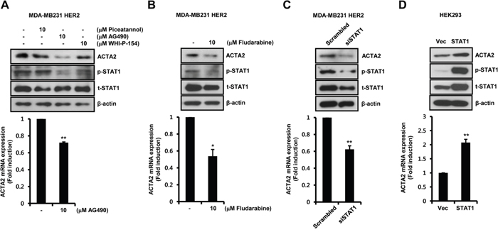 We investigated if STAT1 directly regulated ACTA2 expression. We examined whether STAT1 siRNA overexpression suppressed ACTA2 expression in HER2-overexpressing MDA-MB231 cells. ACTA2 protein decreased with STAT1 siRNA overexpression (Figure 3C). ACTA2 mRNA also decreased to 0.62 ± 0.04-fold of the level in cells overexpressing scrambled STAT1 siRNA (Figure 3C). In addition, HEK293 cells were transfected with STAT1 gene. Levels of ACTA2 protein and mRNA were increased with STAT1 overexpression (Figure 3D). The level of ACTA2 mRNA increased by 2.07 ± 0.12-fold of the vec level in STAT1-overexpressing cells (Figure 3D). We confirmed the levels of phospho-STAT1 and total-STAT1 expression in HEK293 cells (Figure 3D). Based on the results, dimerization of EGFR and HER2 triggered JAK2/STAT1 signaling pathway and induced ACTA2 expression.