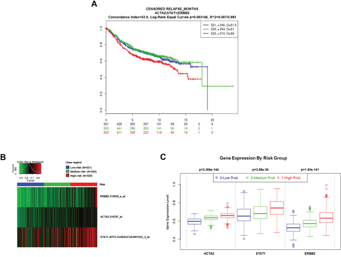 Figure 4: Clinical significance of ACTA2, STAT1, and HER2 expression in breast cancer patients. The clinical value of ACTA2, STAT1, and HER2 was analyzed by SurvExpress software (http://bioinformatica.mty.itesm.mx/SurvExpress). A. Kaplan-Meier curves (relapse-free survival). B. Heatmap. C. Box plots.