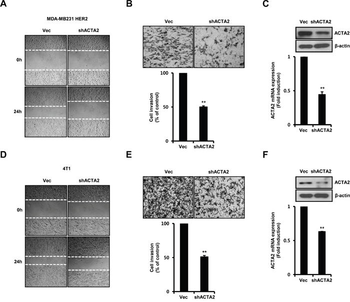 Figure 5: ACTA2 silencing decreases breast cancer cell motility. MDA-MB231 HER2 A-C. and 4T1 mammary carcinoma cells D-F. were stably transfected with vec or ACTA2 shRNA for 48 h and selected with puromycin. (A, D) Migrating ability of cells overexpressing scrambled or ACTA2 shRNA analyzed by wound healing assays. (B, E) Invasiveness of cells with vec or ACTA2 shRNA was analyzed by Boyden chamber assays. (C, F) ACTA2 and β-actin expression was analyzed by western blots. ACTA2 mRNA was analyzed by real-time PCR. Results are representative of three independent experiments. Values are means ± SEM. ** p < 0.01 vs. Vec. Vec; empty vector.