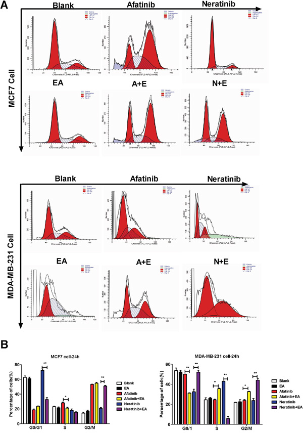Figure 2: Combination of TKIs with EA reduced tumor cell proliferation by inhibiting cell cycle progression. A. 4T1, MDA-MB-231, MCF-7 cells were treated with afatinib/neratinib and/or EA for 24 hours after the cells were harvested and analyzed by FACS. B. The calculated cell cycle distribution. Data are shown as mean ± SD (n=6) of one representative experiment. Similar results were obtained in three experiments. *p < 0.05; **p < 0.01;*** p < 0.001.