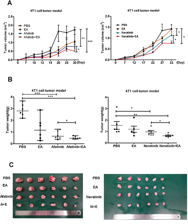 To evaluate whether combined treatment with EA and either afatinib or neratinib had stronger anti-tumor effects in vivo, 4T1 breast cancer cells were implanted subcutaneously into the back of syngeneic Balb/c mice. When all these tumors reached 62.5mm3 in volume at least, mice were treated with afatinib (20 mg/kg) or neratinib (20 mg/kg) alone or together with EA (250 ug/day) for 3 weeks [16], [17], [18]. Consistent with our in vitro results, monotherapy with afatinib or neratinib decreased tumor growth, but treatment with the combination of afatinib or neratinib and EA led to marked tumor shrinkage. It is notable that afatinib combined with EA improved the tumor growth inhibition rate of afatinib alone by 34.2%. While neratinib combined with EA improved the inhibition of tumor growth compared to neratinib alone by only 22.4% (Figure 4).