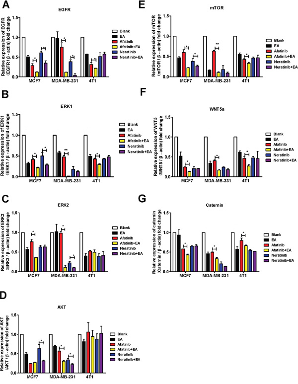 Figure 5: Combination of TKIs with EA inhibited the EGFR pathway. MCF-7, MDA-MB-231 and 4T1 cells were analyzed by real-time pRT-PCR after stimulation with 4μg afatinib/neratinib and/or 30μg EA for 24 hours. A-D. show the impact on EGFR, ERK1, ERK2, AKT, mTOR, WNT5A, and β-catenin. Data are shown as mean ± SD (n=6) of one representative experiment. The images are representative of one experiment. Similar results were obtained in three experiments. *p < 0.05; **p < 0.01;*** p < 0.001.
