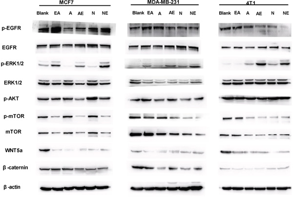 Autocrine WNT signaling contributes to breast cancer cell proliferation via the canonical WNT pathway and EGFR transactivation [11]. Therefore, we investigated whether the molecular mechanism of the synergistic inhibitory effect induced by the combination of afatinib or neratinib with EA was dependent upon the suppression of MAPK-ERK1/2 signaling. As shown in Figure 5, qRT-PCR revealed that afatinib combined with EA suppressed the ERK1, ERK2, EGFR, AKT, mTOR, WNT5a and catenin mRNA in MCF7 and MDA-MB-231 cells compared to irreversible EGFR TKIs alone (Figure 5A-5G), but it is interesting that combined irreversible EGFR TKIs with EA didn’t have obvious suppression on ERK2 in 4T1 (Figure 5C). The combination of neratinib could suppress EGFR, AKT mRNA in MCF7 and MDA-MB-231 cells compared to neratinib alone (Figure 5A&5D). Consistent with the mRNA results, as shown in Figure 6, combined with EA in MCF7 and MDA-MB-231 cells increased p-ERK1/2 expression and reduced expression of ERK1, p-mTOR, mTOR, and WNT5a when compared with afatinib or neratinib alone, while levels of p-mTOR, and mTOR in 4T1 cells also showed similar trends. Interestingly, although EA or it combined with TKIs decreased the expression of ERK1/2 in human breast cancer cell lines(MCF7;MDA-MB-231) but the p-ERK1/2 was increased.