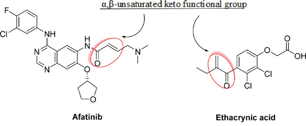 Recently, it was reported that ethacrynic acid (EA), which is used clinically as a diuretic agent, inhibits glutathione S-transferase P1-1 (GSTP1-1) and WNT activity [8], [9], [10]. Glutathione-S-transferase (GST) is overexpressed in human tumors in the reduced form glutathione (GSH) and binds to electrophilic compounds, leading to detoxification of the cells. As a result, the binding of EA to GSH enhances the cytotoxicity of chemotherapeutic agents [9]. Additionally, aberrant activation of the WNT signaling pathway has been detected in breast tumors, and the expression of Frizzled-related protein 1 (sFRP1), a secreted factor that inhibits WNT signaling, is downregulated in many breast tumors and associated with poor prognosis [11]. Interestingly, the chemical structure of α,β-unsaturated keto functional group of EA is similar to that of irreversible TKIs, as shown below; however, the role of EA’s combinational function on the irreversible EGFR TKIs in breast cancer remains unknown. Thus, we asked whether EA could potentiate the antitumor effects of irreversible EGFR TKIs in breast cancer.