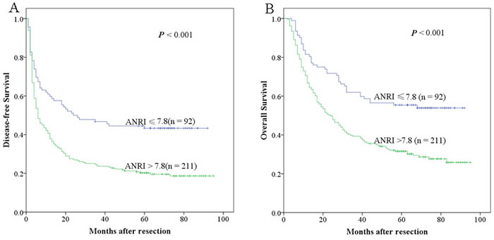 Figure 2: Relationship between ANRI and DFS/OS of HCC patients after hepatectomy. A. DFS of patients with ANRI > 7.8 was significantly shorter than those with ANRI ≤ 7.8 (P < 0.001, log-rank test). B. OS of patients with ANRI > 7.8 was also markedly shorter than those with ANRI ≤ 7.8 (P < 0.001, log-rank test).