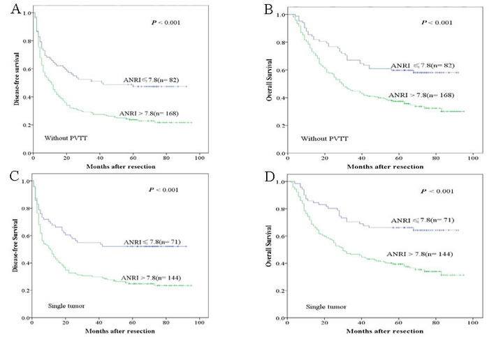 Figure 4: Kaplan-Meier survival curves of different HCC subgroups after hepatectomy. ANRI > 7.8 significantly correlated with shorter DFS and OS in patients without PVTT A., B. and with single tumor C., D.