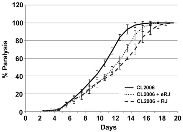 Figure 1: Supplementation of both RJ and eRJ mitigates Aβ toxicity in C. elegans. The CL2006 worms treated with RJ (dashed line) and eRJ (dotted line) showed delayed progression of body paralysis as compared to the control worms (solid line). Each paralysis assay was conducted in triplicates and repeated at least three times with similar results. “% paralysis” indicates the average paralysis among the multi-replicates and error bars represent the standard deviation.