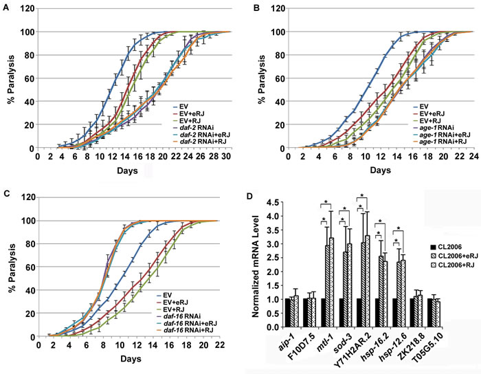 Figure 3: RJ/eRJ requires IIS and DAF-16 to protect against Aβ toxicity in CL2006 worms. A. RJ/eRJ supplementation cannot further postpone the progression of body paralysis in CL2006 worms with reduced IIS by daf-2 RNAi. B. RJ/eRJ supplementation cannot further delay the progression of paralysis in CL2006 worms with reduced IIS by age-1 RNAi. C. Reducing DAF-16 by daf-16 RNAi significantly abolished the beneficial effects of RJ/eRJ delaying the progression of body paralysis in AD worms. Each paralysis assay was repeated at least three independent times with similar results. “% paralysis” indicates the average paralysis among the multi-replicates and error bars represent the standard deviation. D.The transcript levels of aip-1, F10D7.5, mtl-1, sod-3, Y71H2AR.2, ZK218.8, hsp-16.2, hsp-12.6, and T05G5.10 were measured using qRT-PCR in CL2006 worms supplemented with RJ/eRJ (2mg/ml and 1mg/ml, respectively). The data from three independent experiments were pooled to calculate the mean RNA level normalized to the internal control act-1. The standard errors of the mean (SEM) are shown. *, p < 0.05 when compared to non-treated controls.