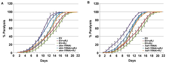 Figure 4: skn-1 and hsf-1 are dispensable in RJ/eRJ-mediated protection against Aβ toxicity. A. RJ/eRJ supplementation can still delay the progression of Aβ toxicity-induced paralysis in AD worms with SKN-1level reduced by skn-1 RNAi. B. RJ/eRJ supplementation can still delay the progression of body paralysis in AD worms with HSF-1 level reduced by hsf-1 RNAi. Each paralysis assay was repeated at least three independent times with similar results. “% paralysis” indicates the average paralysis among the multi-replicates and error bars represent the standard deviation.