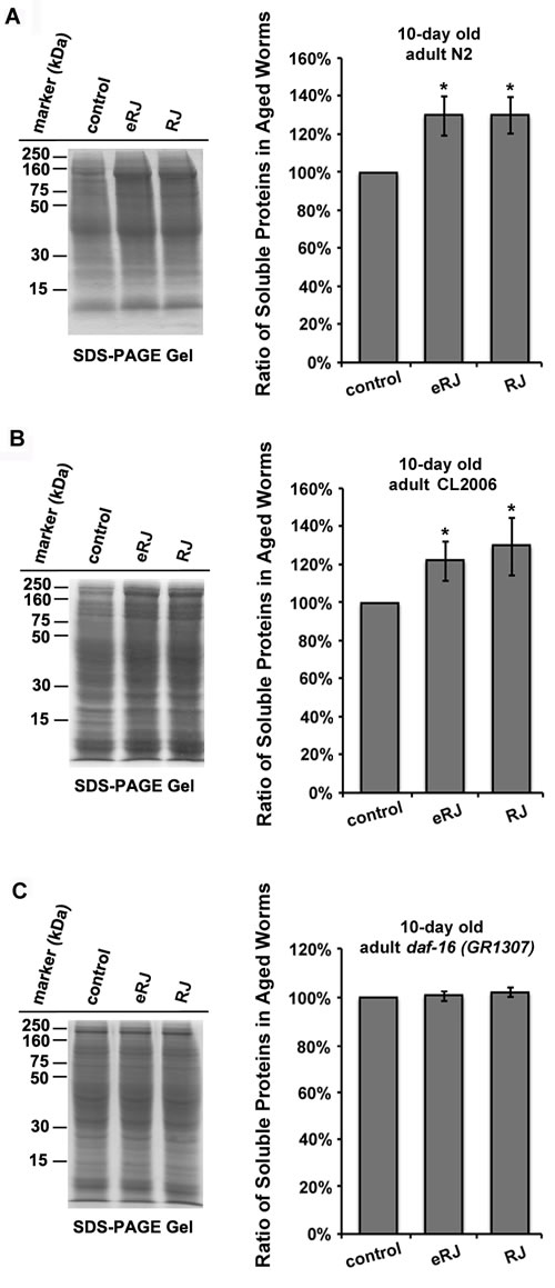 Figure 5: RJ/eRJ improves proteostasis in aged C. elegans in a DAF-16 dependent manner. A. RJ/eRJ treatment increases protein solubility in 10-day old N2 worms. B. RJ/eRJ supplementation increases protein solubility in 10-day old CL2006 AD worms. C. RJ/eRJ treatment cannot increase protein solubility in 10-day old daf-16 (mgDf50) mutant worms. Soluble proteins on the SDS-PAGE gel are quantified by using ImageJ software. Data are expressed as mean intensity from three independent experiments. The standard errors of the mean (SEM) are shown. p value was calculated using Student’s t-test. *, p < 0.05 when compared to controls.