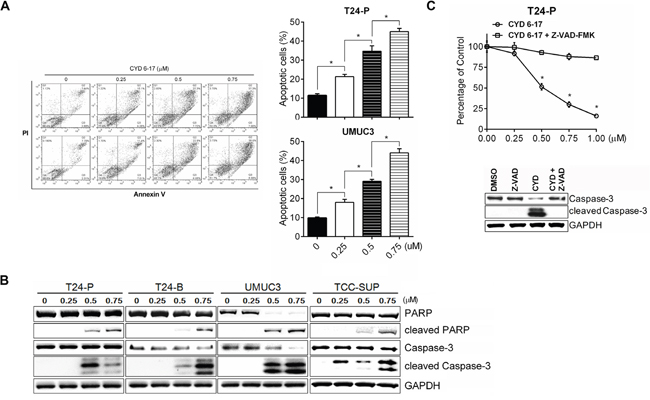 Figure 2: Induction of apoptosis by CYD 6-17 in TCC cell lines. A. The cell death of T24-P and UMUC3 cells were determined 18 h after treatment using PI/Annexin V assay (Left panel) and the degree of cell apoptosis as depicted (Right panel). B. Western blot analyses of the expression of apoptotic markers (cleaved PAPR, cleaved Caspase-3) in TCC cell lines after treatment. C. Effect of Caspase inhibitor on apoptosis induced by CYD 6-17. T24-P cells were pretreated with pan-Caspase inhibitor Z-VAD-FMK (50 µM) for 2 h, followed by DMSO or CYD 6-17 (0.5 μM) treatment for 24 h. Data represented mean ± SD (n = 3). *, p< 0.05.