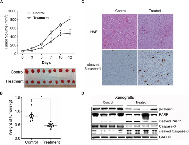 Xenograft tumor tissues were fixed in 4% paraformaldehyde and performed immunohistochemistry on 5-μm-thick paraffin sections after heat-induced antigen retrieval. IHC was carried out by incubating the primary antibody for cleaved Caspase-3 (Cell Signaling Technology, 1:400) for 30 min at room temperature or mouse pre-immune serum as a control in a fully automated Ventana Autostainer model Discover XT ™ (Ventana Medical System, Tuscan, AZ) using Universal DAB Detcction Kit (Ventana Medical Systems). After counterstaining with haematoxylin, slides were mounted.