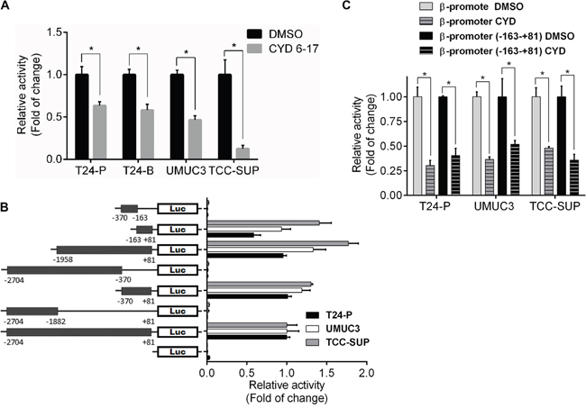 In presence of CYD 6-17, we noticed that endogenous β-catenin mRNA levels markedly decreased but exogenous CA-β-catenin mRNA expression driven by the CMV promoter had no significant change (Supplemental Figure S2B), implying the inhibitory effect of CYD 6-17 on β-catenin gene transcription. Indeed, the activities of β-catenin gene promoter were suppressed in several different TCC cell lines treated with CYD 6-17 (Figure 5A). We subsequently identified the core region (-163-+81) of β-catenin gene promoter responsible for its activities in T24, UMUC3 and TCC-SUP cells (Figure 5B). We further demonstrated that the main effect of CYD 6-17 on suppressing β-catenin gene promoter activities was on this core region as well (Figure 5C).