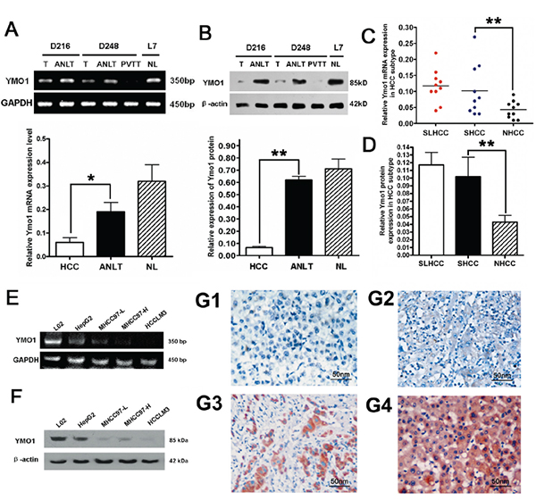 Figure 1: Expression level of YMO1 in HCC tissues and HCC cell lines. A. The mRNA level of YMO1 was determined by RT-PCR in HCC tissues (n=30) and in ANLTs (n=30). B. The YMO1 protein level was determined by western blot. The representative western blots of normal liver tissues, HCC tissues, ANLT and portal vein tumor thrombosis (PVTT) are shown. The average value of β-actin protein was used to normalize to the level of YMO1 protein. C. The YMO1 mRNA levels in SLHCC (n=10), SHCC(n=10) and NHCC (n=10) were compared. D. Three subtypes of HCC tissues were compared for the YMO1 protein expression. E. The relative expression level of YMO1 mRNA in normal cell line and HCC cell lines, determined by RT-PCR. F. The expression levels of YMO1 protein correlated with the invasion potential of HCC cell lines. G1-G3. Representative image for YMO1 immunohistochemistry staining in HCC tissues. G4. Representative image for YMO1 diffuse strong staining in ANLT. Original magnification×400. *, P < 0.05; **, P < 0.01.