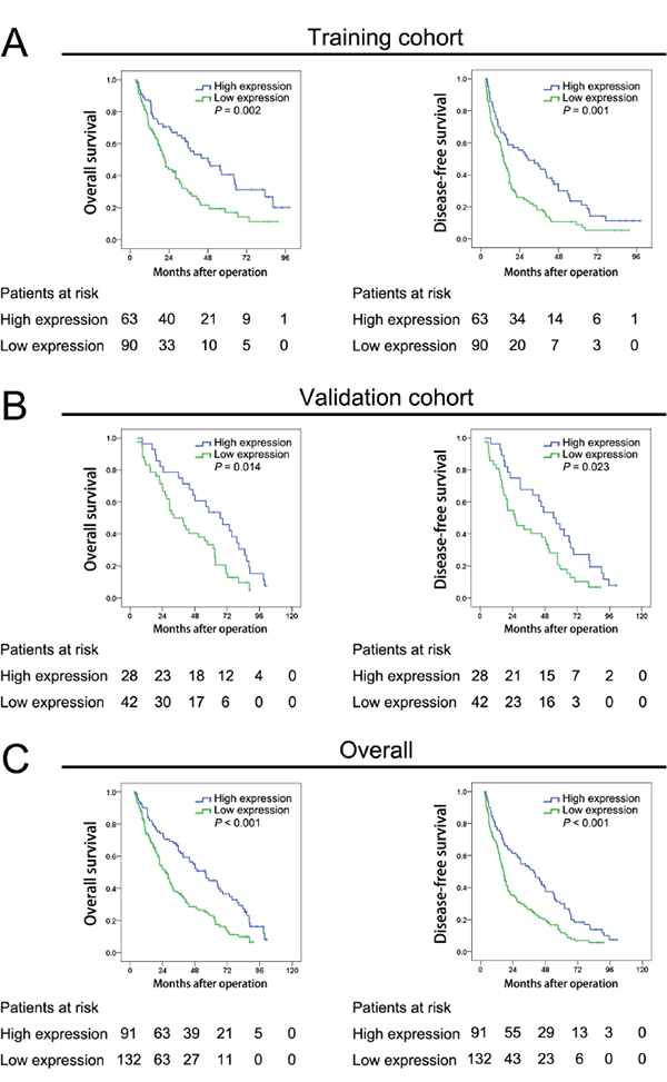 From January 2003 to December 2007, 378 patients with live tumor underwent surgical resection in Department of Surgery, Xiangya Hospital of Central South University (CSU) and 283 patients with live tumor underwent surgical resection in Department of Abdominal Surgical Oncology, The Affiliated Cancer Hospital of Xiangya School of Medicine, CSU were collected. Among them, 160 patients were randomly selected into training cohort from Xiangya Hospital and 80 patients were randomly selected into validation cohort from The Affiliated Cancer Hospital. 7 patients (6 patients with cholangiocarcinoma, 1 patients with haeangioma) in training cohort and 10 patients (7 patients with cholangiocarcinoma, 3 patients with haeangioma) in validation cohort were excluded from this study. At last, 153 HCC patients were in training cohort and 70 HCC patients were in validation cohort (Supplementary Figure S3). Matched HCC tissue and the adjacent non-tumor liver tissue (ANLT) specimens were obtained from these HCC patients Normal liver tissues were obtained from 6 patients with giant hemangioma during hepatic resection. Tissue specimens were fixed by formalin immediately upon collection and then paraffin-embedded. The pathological diagnosis for all the cases was made by at least two Board Certified pathologists working at the Department of Pathology in the Xiangya Hospital of CSU. Among which, 30 subjects with matched fresh HCC tissues and ANLTs were randomly selected for real-time PCR and western blot analysis. The 30 HCC patients were divided into three subgroups as follows: SHCC: Small HCC (<5 cm in diameter); SLHCC: This subtype of HCC has just a solitary node, >5 cm in diameter, and grows expansively within an intact capsule or pseudocapsule [32]. NHCC: Nodular HCC, this subtype of HCC has more than 2 nodes. All research protocols strictly complied with REMARK guidelines for reporting prognostic biomarkers in cancer [33]. Prior informed consent was obtained from all patients and the study was approved by the Ethics Committee of Xiangya Hospital of CSU.