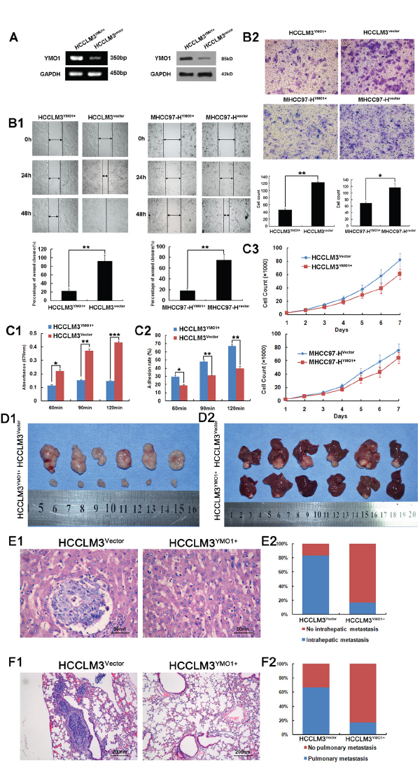 Figure 3: Overexpression of YMO1 suppresses HCC cell migration and invasive potential in vitro and in vivo. A. The expression efficiency of pcDNA3- YMO1 was evaluated by RT-PCR and Western blot analysis. B1. The indicated cell lines were scratched and wound closures were measured for 0, 24 and 48 hours culture. B2. The indicated cells that invaded through matrigel-coated transwell were stained with crystal violet. C1. Cells were inoculated in fibronectin-coated plastic dishes and absorbance at 570 nm was measured. C2. Monolayer 106 cells were plated on monolayer of HCC cell. After incubation and elution, rate of adherence was measured. C3. HCC cells were subjected to proliferation rate analysis. The cell numbers are the medians of 3 independent experiments (mean±SD). D1. HCC subcutaneous xenograft model with empty vector and with pcDNA3- YMO1 transfected HCCLM3 cells. D2. Assessment of tumor growth promotion in orthotopic xenograft of HCCLM3YMO1+ and HCCLM3vector group. The representative H&E staining images of E1. intrahepatic metastasis and F1. pulmonary metastasis. The percentage of mice with or without intrahepatic and pulmonary metastasis was calculated and compared.*, P < 0.05; **, P < 0.01; ***, P < 0.001.