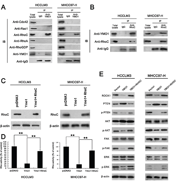 Figure 4: YMO1 suppresses cell motility and invasion by interacts with RhoC and suppressing Rho-GTPase activity. A. YMO1 binding to Rho GTPase components in HCCLM3 and MHCC97-H cells. Cell lysates were immuno-precipitated with rabbit IgG or rabbit anti-YMO1 antibody, and the presence of each component in the precipitates was blotted with the antibody against each molecule. B. Results of co-immunoprecipitation. The cell lysate was immuno-precipitated by anti-RhoC antibody and immuno-blotted against anti-YMO1 antibody. C. RhoC expression in HCCLM3 and MHCC97-H only transfected YMO1 vector or cotransfected YMO1 and RhoC vector and D. Levels of total and GTP-bound RhoC were determined in two HCC cell lines. Rho activity in cells transfected with pcDNA3 empty vector, pcDNA3 containing YMO1 or pcDNA3 containing YMO1 and RhoC. Rho activity was normalized to the relative band intensities on the immunoblot measured by densitometry. E. ROCK1, PTEN, p-PTEN, AKT, p-AKT, FAK, ERK and p-ERK protein expression in these HCC cells. **, P < 0.01.