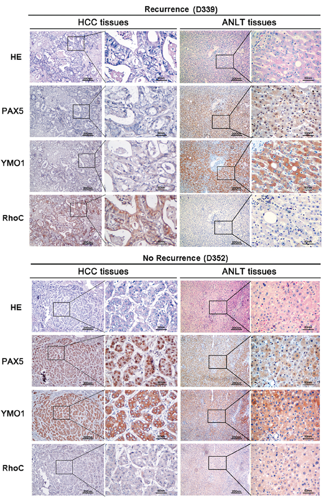 Figure 6: Protein levels of YMO1, PAX5 and RhoC in human HCC samples. Representative immunohistochemical staining of PAX5, YMO1 and RhoC in serial sections of samples from a patient with recurrence (sample No. D339) and a patient without recurrence (sample No. D352).