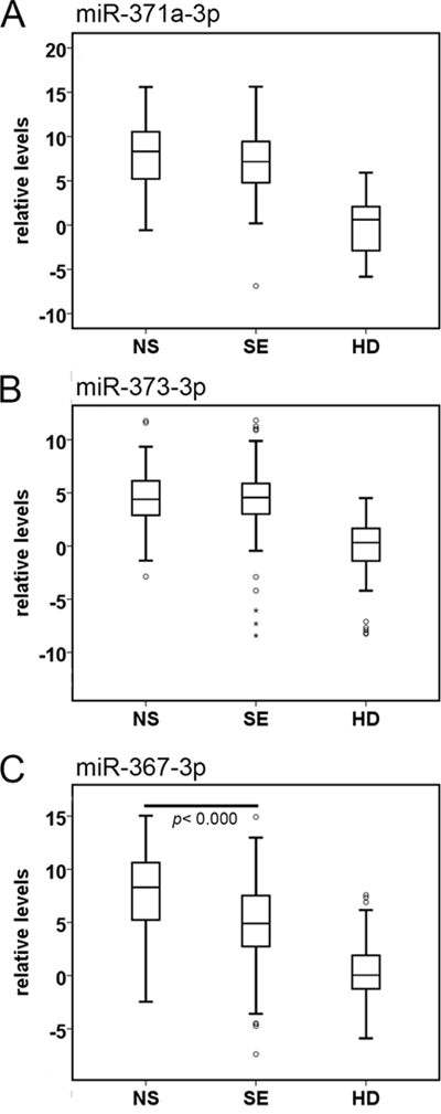 Figure 3: Boxplots of the relative serum levels. A. miR-371a-3p, B. miR-373-3p, and C. miR-367-3p of NS (n = 110), SE (n = 128), and HD (n =104). For comparison of the levels of each miR in serum of NS or SE with HD: p<0.000, Mann-Whitney U Test. Abbreviations: NS: non-seminoma; SE: seminoma; HD: healthy donor.