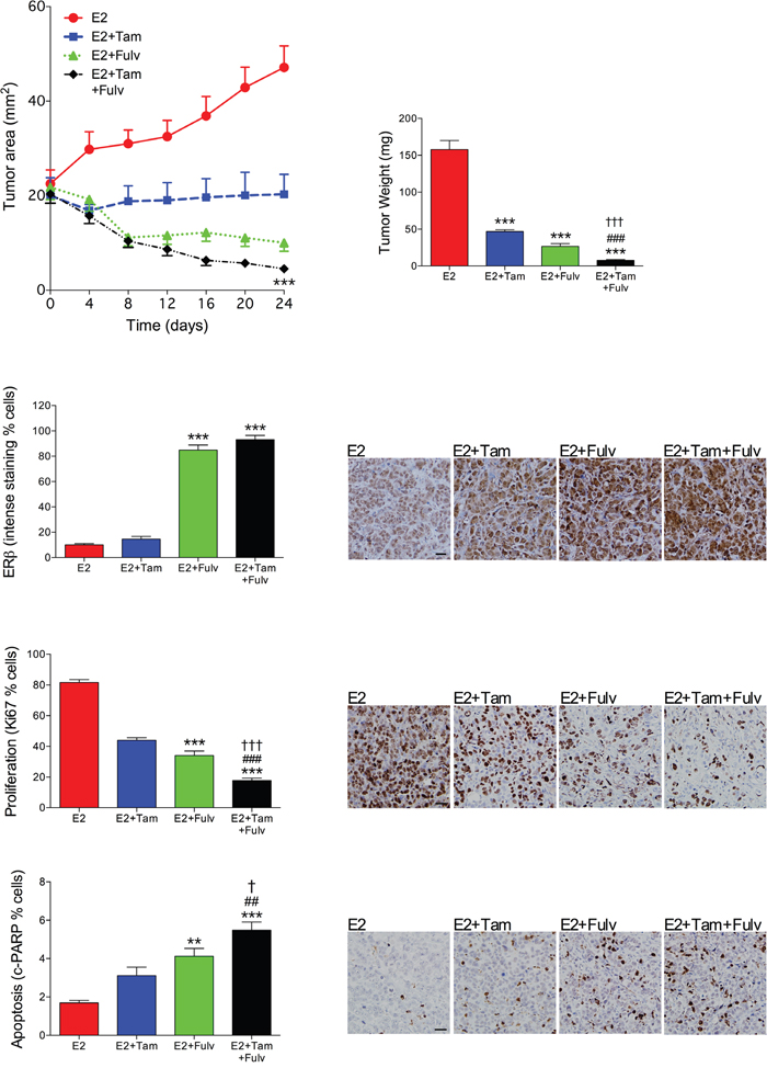 Figure 1: Fulvestrant in combination with tamoxifen enhanced tumor regression in vivo compared with either treatment alone. OophorectomizedBalb/C-nu/nu mice were supplemented with physiological levels of estradiol (E2) and injected with MCF-7 cells in the mammary fat pad. At similar tumor sizes, one group continued with E2 treatment and the other group received an additional tamoxifen (Tam) treatment (1 mg/mouse every second day s.c.), fulvestant (Fulv) (5mg/mouse twice weekly s.c.), or their combination. Tumor sections from the different treatment groups were stained for ERβ (clone PPG5/10), proliferation (Ki67) or apoptosis (cleaved PARP (cPARP)) and quantified as described in Materials and Methods. Representative sections from each treatment group are shown. Scale bars=50 μm. **P<0.01 and ***P<0.001 compared to E2, ##P<0.01 and ###P<0.001 compared to E2+Tam, and † P<0.05 and ††† P<0.001 compared to E2+Fulv, n=8-21 in each group. Bars and dots represent mean±SEM.
