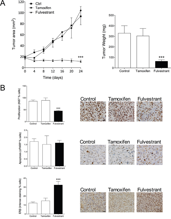 Figure 3: Therapeutic effect of fulvestrant in triple negative ERβ+ MDA-MB-231 breast cancer explants. A. MDA-MB-231 cells (ERα-/ERβ+) were injected in the mammary fat pad in nude mice as described under figure 1. At similar tumor sizes, one group received tamoxifen treatment (1 mg/mouse every second day s.c.) or fulvestant (5 mg/mouse twice weekly s.c.). ***P<0.0001 compared to controls and tamoxifen, n=6-10 in each group. Dots represent mean±SEM. B. Tumor sections from the different treatment groups were stained for ERβ (clone PPG5/10), proliferation (Ki67) or apoptosis (cleaved PARP (cPARP)) and quantified as described in Materials and Methods. Representative sections from each treatment group are shown. Scale bars=50 μm. ***P<0.0001 compared to controls and tamoxifen, n=9 in each group. Bars represent mean±SEM.