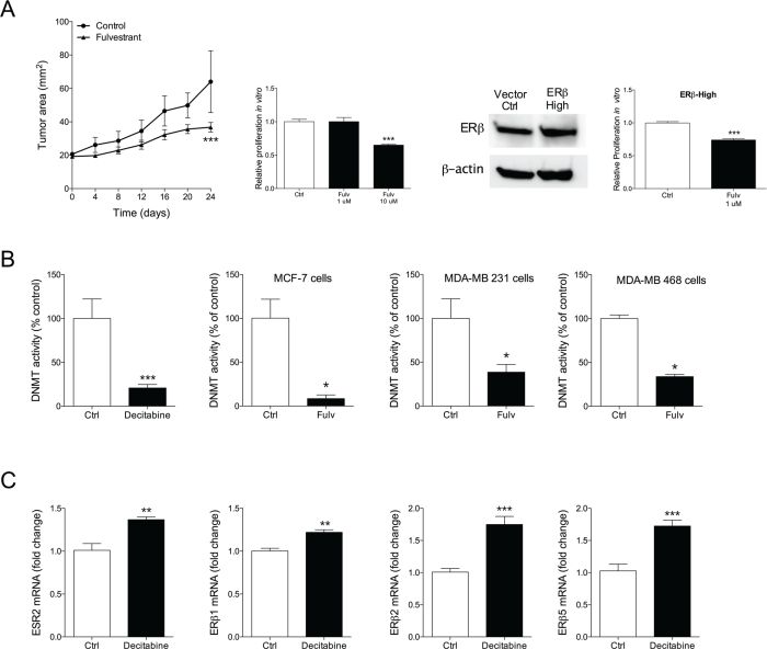 Figure 5: A. Moderate therapeutic effects of fulvestrant in triple negative weak ERβ+ MDA-MB-468. MDA-MB-468 (ERα-/weak ERβ+) cells were injected in the mammary fat pad in nude mice as described under figure 1. ***P<0.001 compared to control, n=6-8 in each group. Parental MDA-MB-468 or MDA-MB-468 where ERβ was knocked-in, confirmed with Western blot, were cultured in vitro and exposed to fulvestrant (Fulv) at different concentrations. Proliferation was measured, ***P<0.001 compared to control, n=6 in each group. Bars represent mean±SEM. B. Fulvestrant inhibited DNA methyltransferase activity (DNMT). DNA methyltransferase activity was measured in nuclear extract from the different cell lines exposed to fulvestrant. The DNMT inhibitor decitabine was used as a positive control. *P<0.05, ***P<0.001 compared to control, n=6 in each group. Bars represent mean±SEM. C. Inhibition of DNA methyltransferase activity increased ERβ and its isoform expression. Cells were exposed to decitabine and ERβ and its isoforms were analyzed at mRNA levels, **P<0.01 and ***P<0.001 compared to control, n=6 in each group. Bars represent mean±SEM.