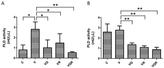 PLD activity was measured using a PLD activity colorimetric assay kit (BioVision) according to the manufacturer’s instructions. Briefly, 5 x 105 cells were washed with PBS and were lysed in PLD Assay Buffer. The samples or standard (50 μL per well) and reaction mix (50 μL per well) were each added to a 96-well plate. Absorbance was measured at 570 nm using a Multiskan FC microplate photometer in a kinetic mode to calculate the PLD activity of the samples.