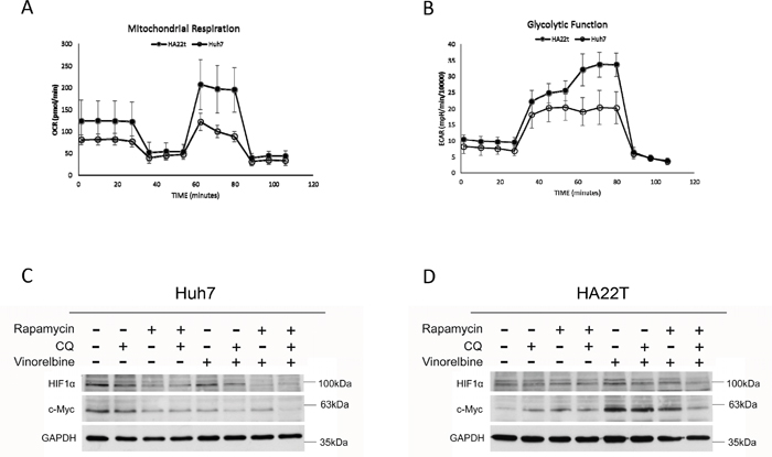 Figure 5: Basal metabolic phenotypes and mitochondrial damage after triplet drug combination treatment. Basal metabolic phenotypes of Huh7.5.1 and HA22T cells were evaluated for OCR (A) and ECAR (B) with an Extracellular Flux Analyzer. Huh7.5.1 (C) and HA22T (D) cells were treated with vinorelbine, with or without CQ, Rapa, or CQ and Rapa. After incubating 48 h, cells were harvested for western blot analysis to evaluate energy metabolism, and GAPDH was used as an internal control.
