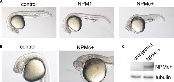 Figure 1: Embryo morphology after NPM1 and NPMc+ expression in zebrafish embryos. (A) Overall view of control (uninjected), NPM1 (90% of injected embryos showing the reported phenotype) and NPMc+ (85% of injected embryos showing the reported phenotype in multiple experiments) expressing embryos at 24 hpf. (B) Head structures in control and NPMc+ expressing embryos at 24 hpf. (C) Western blot analysis of NPMc+ expression levels in zebrafish embryos.