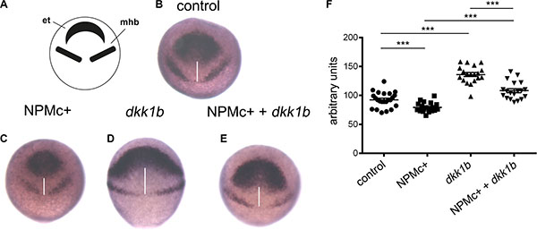 Figure 2: Analysis of CE movements at gastrulation. Whole mount in situ hybridization for rx3 and pax2a markers of the eye field and telencephalon region (et) and mid-hindbrain boundary (mhb), respectively. All embryos are at 90% epiboly, dorsal view. Distance between rx3 and pax2a expression regions was measured with ImageJ; statistical significance was assessed with a Student’t test. (A) Schematic representation of areas of markers expression. (B) Representative example of uninjected control. Embryos injected with: (C) NPMc+ mRNA; (D) dkk1b mRNA; (E) NPMc+ and dkk1b mRNAs. (F) Graphic representation of the distance between rx3 and pax2a expression regions for each measured sample (20 embryos were analyzed for each condition).