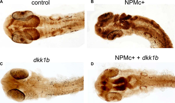 Figure 3: Canonical Wnt activation in 28 hpf embryos. DAB-staining for GFP expression in TOP:GFP embryos at 28 hpf. Embryos are shown in dorsal view. (A) uninjected control (32/32). Embryos injected with: (B) NPMc+ mRNA (27/28); (C) dkk1b mRNA (32/32); (D) NPMc+ and dkk1b mRNAs (16/22).