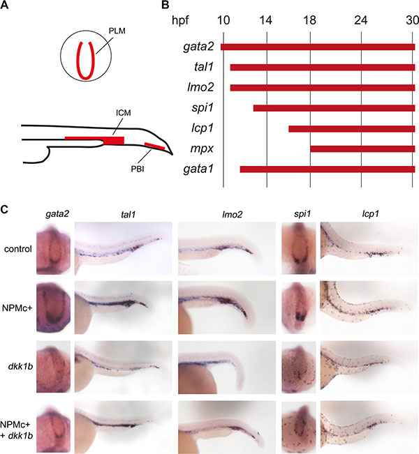 Figure 4: Expression of hematopoietic markers during early zebrafish hematopoiesis. (A) Schematic representation of primitive hematopoietic organs in zebrafish embryos as seen in posterior (top) and lateral (bottom) views showing PLM (posterior lateral mesoderm), ICM (intermediate cell mass) and PBI (posterior blood island). (B) Timeline of expression of hematopoietic markers expressed in the posterior hematopoietic region of zebrafish embryos during primitive hematopoiesis. (C) Whole mount in situ hybridization for gata2 (15 somites embryos, dorsal and posterior view. The phenotypes were encountered in a number of embryos as detailed for each marker hereafter. Control: 41/41, NPMc+: 29/32, dkk1b: 31/31, NPMc+ and dkk1b: 20/27), tal1 and lmo2 (24 hpf embryos, lateral view. For tal1: control: 51/52, NPMc+: 65/85, dkk1b: 30/43, NPMc+ and dkk1b: 17/34. For lmo2: control: 44/45, NPMc+: 33/34, dkk1b: 27/33, NPMc+ and dkk1b: 24/33), spi1 (15 somites embryos, dorsal and posterior view. Control: 32/32, NPMc+: 21/23, dkk1b: 33/34, NPMc+ and dkk1b: 22/28), lcp1(30 hpf embryos, lateral view. Control: 23/24, NPMc+: 26/28, dkk1b: 25/25, NPMc+ and dkk1b: 30/37).