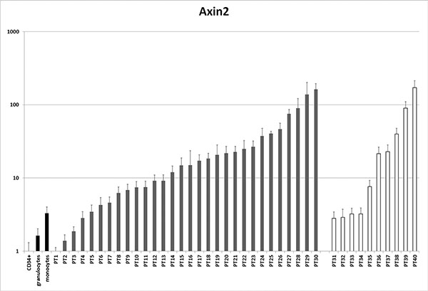 AXIN2 expression (forward primer: 5’-ACAACAG CATTGTCTCCAAGCAGC-3’, reverse primer: 5’-GCGC CTGGTCAAACATGATGGAAT-3’) was analyzed in RNA from blasts of 30 AML patients bearing NPM1 mutations and 10 AML patients with normal karyotype and no NPM1 mutations using SybrGreen technology (for genetic characteristics see Supplementary Table S1) with TBP as a housekeeping control (forward primer: 5’-CGGCTG TTTAACTTCGCCTTC-3’, reverse primer: 5’-CACACGC CAAGAAACAGTGA-3’). Normal CD34+ progenitors, granulocytes and monocytes were included as control.