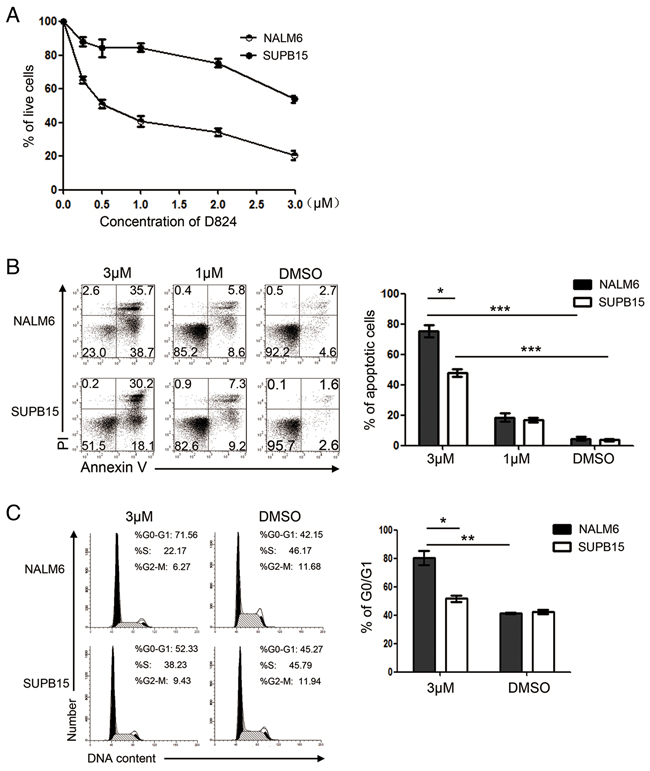 Figure 1: GZD824 inhibits proliferation and induces apoptosis and G0/G1 cell-cycle arrest of human B acute lymphoblast leukemia (pre-B ALL) cell lines. A. GZD824 cytotoxicity in pre-B ALL cells: NALM6 and SUPB15 were incubated with GZD824 at various concentrations for 24 hours, and viability was determined by CCK8 assay. Viability was calculated relative to time-matched untreated controls. D824 is short for GZD824 in the following figure. B. Left: representative flow cytometric analysis of NALM6 and SUPB15 cells treated with DMSO, 1μM, or 3μM of GZD824 for 24 hours. Right: Statistical analysis of AnnexinV-positive cells in GZD824 treated NALM6 and SUPB15 cells. C. Left: representative images of cell cycle distribution in NALM6 and SUPB15 cells treated with DMSO or 3μM of GZD824 for 24 hours. Right: Statistical analysis of the distribution of cells in G0/G1 phases in GZD824 treated cells. Data are shown as the mean ± SEM (error bars) from three independent experiments. Significance values: *P<0.05; **P<0.01; ***P<0.001.
